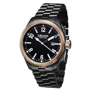 The Terra men's wristwatch by Golana Swiss is information on stand-out style. Stainless Steel craftsmanship adds an air of adventure to the Golana Swiss watch. Altogether sophisticated, the Terra men's timpiece is really a must-have for almost any collection. Black dial. Arabic numerals and stick index hour markers. Luminescent hands. Date at 3 o'clock. Three hand date. Stainless steel bicolour black and rose gold tone case. Round shaped case inside a polished and brushed finish. Pull and push fluted crown. Screw-down closed case back. Stainless steel rose gold tone bezel. Fixed bezel. Fold-over clasp and safety flap. Battery powered quartz movement Swiss made. Men's watch. Water resistant against 100 m (330 feet). Sapphire coated crystal. Case measures: 45 mm W x 52 mm L x 13 mm T. Band measures: 21 mm W x 9.5 inches L
